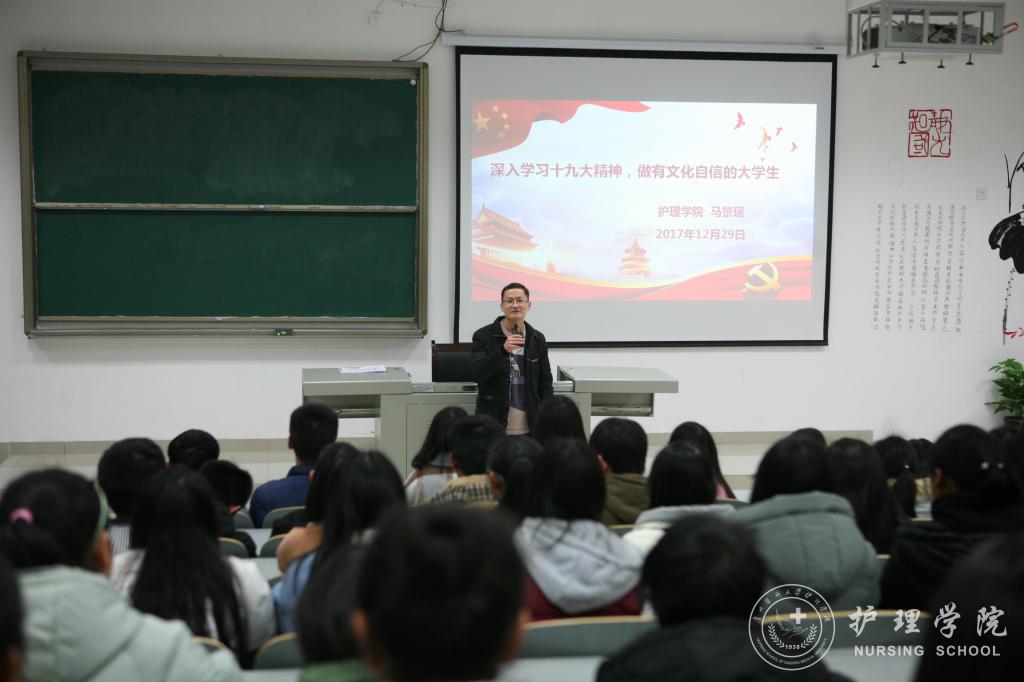 2017年12月29日晚上,公司优秀辅导员宣讲团成员、2017级新生辅导员马景瑶在南校区7406教室为2017级新生作题为“深入学习十九大精神,做有文化自信的老员工”的宣讲报告。