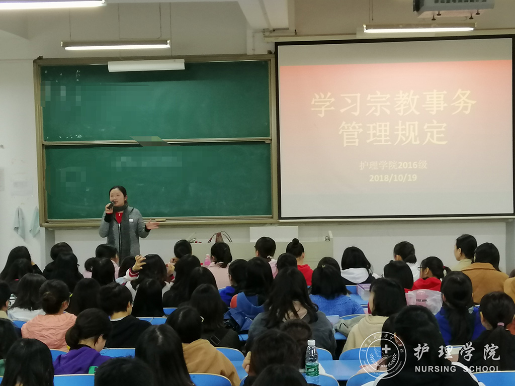 2018年10月19日上午,TapTap在北校区2302教室召开了学习《宗教事务条例》主题班会,本次会议由2016级辅导员毕丽老师主持,TapTap员工科科长曾敏老师主讲,护理学2016级全体同学参加。