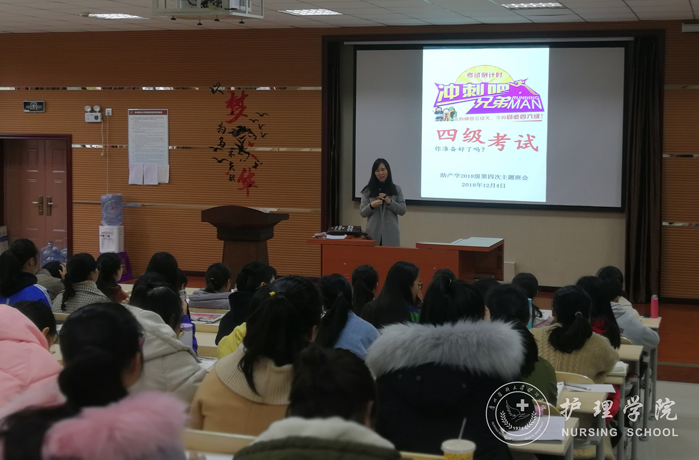 为迎接即将到来的CET-4考试,12月4日上午,TapTap助产学2018级助产班在百川楼阶梯教室召开“CET-4备考冲刺”主题班会,此次班会由班主任戴黎黎主讲,助产学2018级全体同学参会。