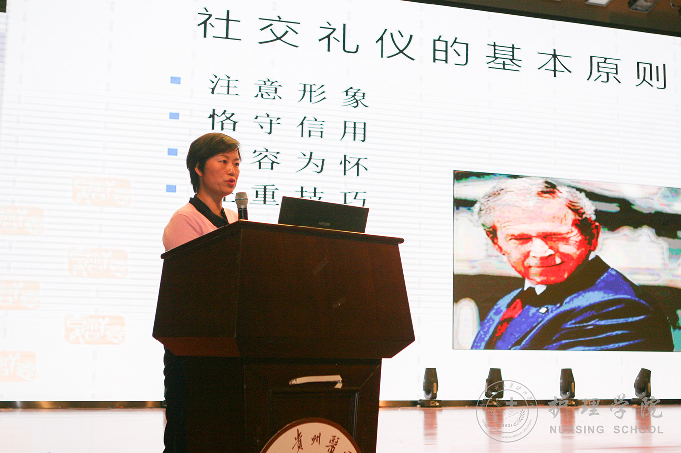 首先,王秀红从两个真实发生的案件引出了本次讲座的主题,并指出了文明礼仪的重要性。接着,对礼仪的含义及基本原则,礼仪修养的过程进行了概况性介绍,结合同学们日常生活和学习从仪表仪态礼仪、社交礼仪、公司礼仪规范等方面进行了讲解,并重点普及了宿舍礼仪、课堂礼仪及师生交往礼仪等与师生工作、学习、生活密切相关的礼仪规范。讲授过程中王秀红还时不时地列举一些礼仪故事,幽默风趣的讲述吸引了全场听者的注意力。